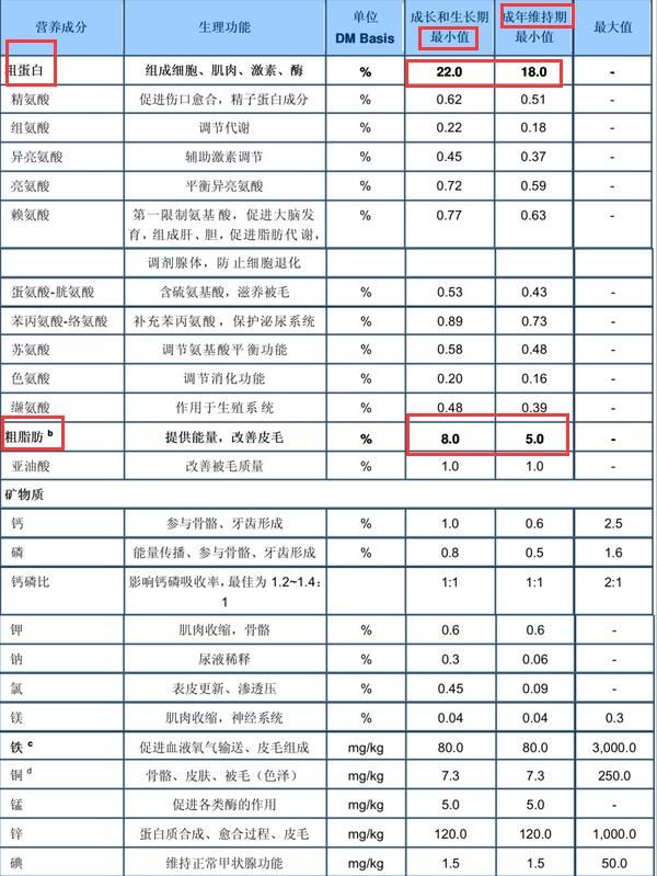 注意这个标准中有个成长期的最低值,还有个成年以后的最低值,这样侧面说明为啥一般同品牌狗粮的幼犬粮要比成犬粮要贵,因为需要的营养和能量要高,就需要厂家在原料上面下功夫保证这些营养和能量了。