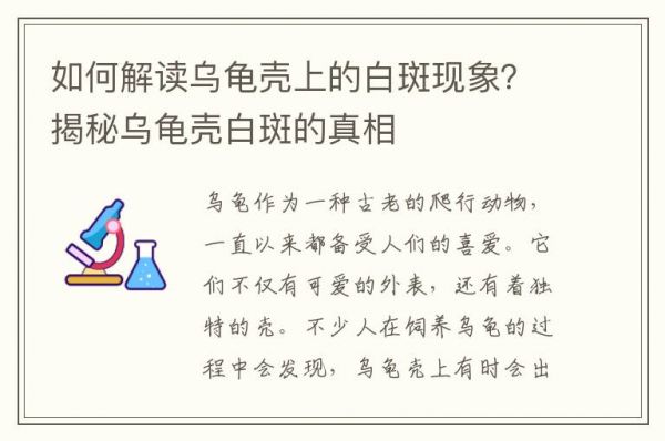 乌龟壳上的白斑可能是多种原因导致的。在发现白斑时,首先要确定其原因,再采取相应的措施。保持良好的养殖环境、合理搭配饮食以及定期检查乌龟的健康状况,都有助于预防乌龟壳白斑的发生。