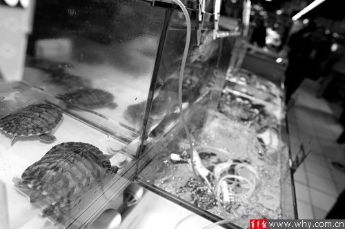 中山公园龙之梦下的家乐福,水产品池子中静静趴着四只手掌大小的龟,与之相邻的水池里则养着甲鱼。龟的背甲近20厘米长,颜色很深,成体面部花纹看起来像钻纹,头部的红色花纹格外显眼。