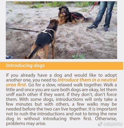 如果你已经有一只狗并且想要介绍(领养)另一只狗,你需要先在中性区域引入它们(让它们在陌生的安全的环境相见)。 一起慢慢地,轻松地散步。 走一走,一旦你确定两只狗都没事,如果他们想要接触的话,让他们互相嗅闻。 如果他们不这样做,请不要强迫他们。 对于一些狗,介绍只需要几分钟,但是有些,可能需要几个散步过程才能生活在一起。 重要的是不要急于介绍,不要先引入新狗(直接带新狗回家)。 否则,可能会出现问题。