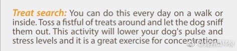 搜索零食:你可以每天散步或在家里这样做。 扔一把零食在周围,让狗嗅出来。 这项活动将降低你的狗的压力水平,这是一个很好的集中力练习方法。