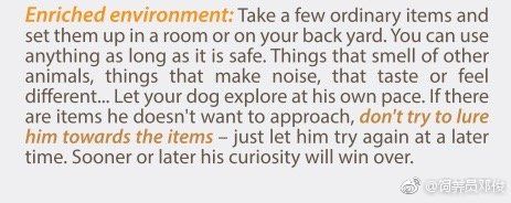 环境丰容:拿一些普通物品放在房间或后院。 你可以使用任何东西,只要它是安全的。 嗅起來很像其他动物的东西,产生噪音的东西,味道或感觉不同的东西。 让你的狗按照自己的节奏探索。 如果有他不想接近的物品,不要试图引诱他走向物品 - 只是让他稍后再试。 迟早他的好奇心会赢得胜利。