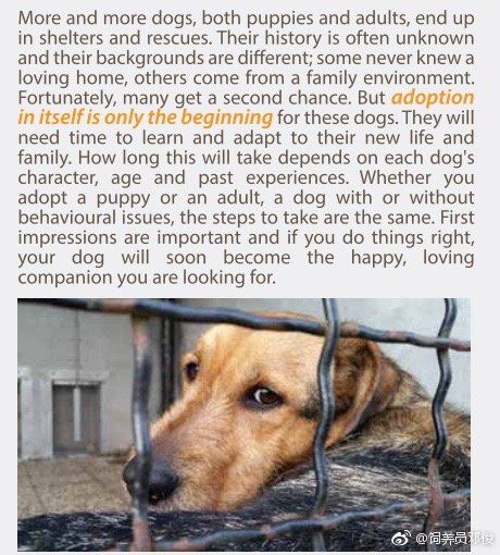 越来越多的狗,无论是小狗还是成年狗,都最终住進了救助站和被救援。 他们的历史往往是未知的,他们的背景也不同; 有些狗有一个爱心的家,有些狗来自家庭环境。 幸运的是,许多狗获得了第二次机会。 但收养本身只是这些狗的开始。 他们需要时间来学习和适应他们的新生活和家庭。这需要多长时间取决于每只狗的性格,年龄或收养人,有或没有行为问题的狗,采取的步骤是相同的。 第一印象很重要,如果你做对了,你的狗很快就会成为你正在寻找的快乐,有爱心的伴侣。