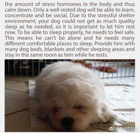 狗每天需要大约16个小时的睡眠时间。 睡眠对于身体和大脑的再生恢复有好處,减少体内压力荷尔蒙的量,从而對平静下来非常重要。 只有一只休息良好的狗才能学习,有集中注意力并成为社交者。 由于住房环境压力很大,你的狗不能得到他所需要的高质量的睡眠質素,所以现在让他休息是很重要的。 为了能够正常入睡,他需要感到安全。 这意味着他不能孤单,他需要许多不同的舒适的地方睡觉。 为他提供许多狗床,毯子和其他睡眠区域,并在他休息时陪在他身旁。