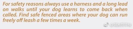 出于安全考虑,请记得使用牵引带和嘴套。直到您的狗学会唤回、找到给狗的安全的围栏区域,您的狗可以每周几次自由活动。