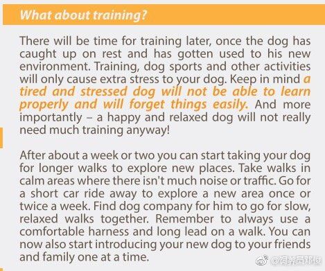 一旦狗已经休息很好并且习惯了他的新环境,将有时间进行训练。 训练,狗运动和其他活动只会给您的狗带来额外的压力。 请记住,疲惫和压力大的狗将无法正常学习,容易忘记事情。 而且更重要的是 - 快乐和放松的狗无论如何都不需要太多训练!