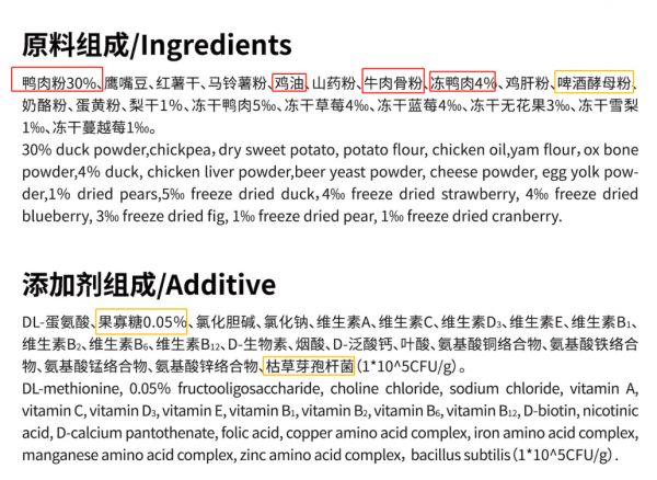 ▲ 动物蛋白高达80%,鸭肉粉、鸡油、牛肉骨粉、冻鸭肉,冻干鸡肉等动物性来源均可为成长期幼犬提供充足营养,助力肌肉和体型发育;