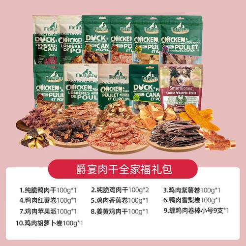 纯脆鸭肉干100g*1 纯脆鸡肉干100g*2 鸡肉紫薯卷100g*1 鸭肉红薯卷100g*1 鸡肉香蕉卷100g*1 鸭肉雪梨卷100g*1 鸡肉苹果派100g*1 姜黄鸡肉干100g*1 缠鸡肉卷棒小号9支*1 鸡肉胡萝卜卷100g*1这些美味的零食,不仅能让狗狗享受美味的同时,还能帮助它们保持健康的牙齿,真是一举两得!