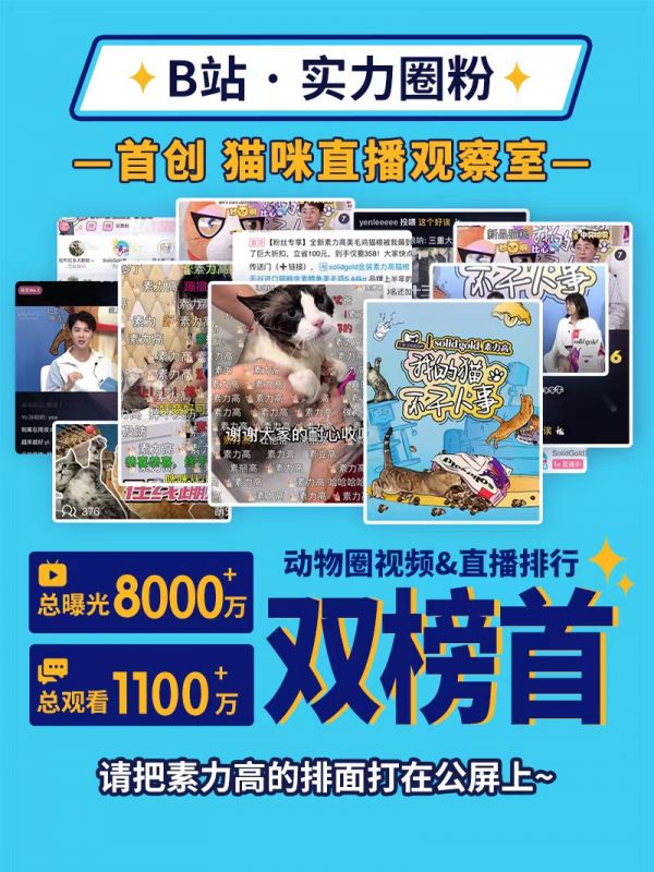 在深度剖析Z世代行为逻辑下,Solid Gold素力高承载着健合集团旗下品牌首次进军Z世代聚集基地——哔哩哔哩的重大战略布局,打造出与新生代链接的语言体系,助力品牌与新品真正融入Z世代生活圈层。首先,Solid Gold素力高借助全网寻猫的悬念预热,调动起Z世代主动参与、积极互动的欲望;接着,通过场景沉浸式微综艺直播《100只猫不干人事人类观察室》,与天猫观察室店铺直播无缝承接助推,全面撩动年轻人的养宠兴趣,当晚,直播观看人次超21万,斩获当晚B站宠圈人气峰值TOP1。相关话题视频总观看量超1100万,成功在用户与内容的强关联、强互动中,精准触达引流,实现新品及品牌的超强曝光和转化。
