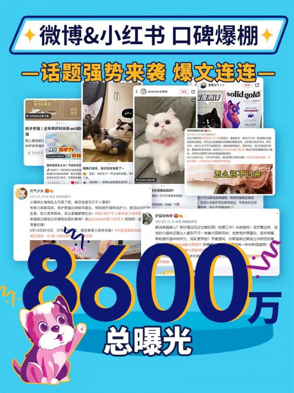 新的习惯、生活方式和个性,正在影响年轻人的消费选择。尤其在以Z世代为主导的新兴宠物市场,如何引发年轻消费者共鸣已成为决胜市场的关键。Solid Gold素力高深知与年轻人构建沟通语言的重要性。此次新品上线Solid Gold素力高从养宠者对猫咪应激及感冒等问题引发的焦虑出发,通过“我的猫不干人事”的创意话题,与“垂类+泛兴趣圈层”的组合策略,深度入侵B站、微博、小红书、抖音四大主流平台,实现全网曝光量超1.6亿,互动人数超28万,更是在微博及小红书引发猫友热烈讨论,双平台曝光量超8600万,强势攻占Gen Z养宠者心智,掀起一股“免护力”养宠新风。