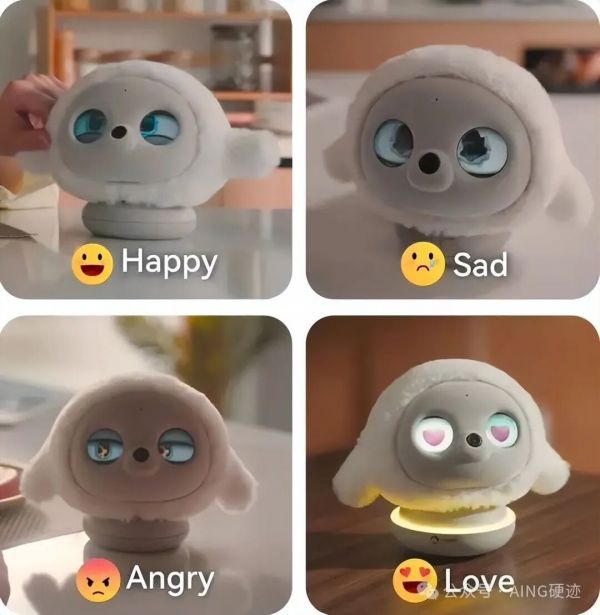 同时,它的大眼睛是一个显示屏,通过传感器与AI训练分析来“察言观色”,然后回应用户。比如用户感到疲惫时用温暖 “抱抱” 回应,饿了还会发出肚子咕咕叫音效,等着用户拿真实食物投喂,之后它就记住了,再看到这食物眼睛里会出现对应图标,还会模拟咀嚼。
