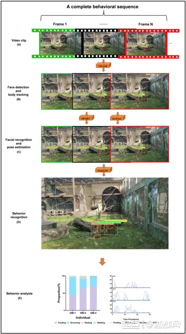 为解决行为智能分析中面临的共性难题,近日,西北大学教授郭松涛团队基于行为学分析原理,从行为的结构分析,利用人工智能技术,设计了《哺乳动物行为自动定量测量的人工智能框架》,融合“猴脸识别”技术,最终实现了可以区分和追踪野生动物个体身份的行为精准自动识别与测量,以及自动汇报行为节律和时间分配结果的行为自动化监测的技术突破。