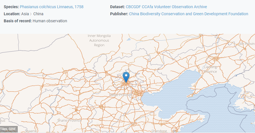 近日,中国生物多样性保护与绿色发展基金会(中国绿发会、绿会)GBIF工作组在全球生物多样性信息网络(GBIF)平台录入并发布河北北戴河环颈雉数据,供参考及下载。