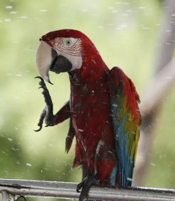 7月11日,沂南县竹泉村动物园,一只金刚鹦鹉在高温下享受冲凉。