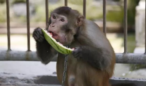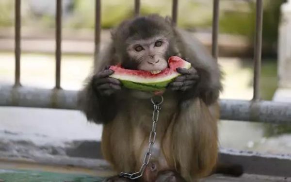 7月11日,沂南县竹泉村动物园,一只猕猴在吃西瓜解暑。
