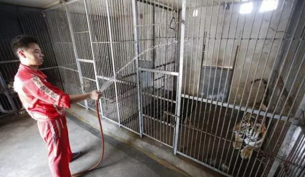 7月11日,沂南县竹泉村动物园,饲养员给东北虎冲凉降温。
