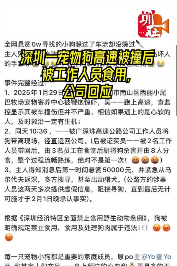 深圳一宠物狗高速被撞后被工作人员食用,公司回应