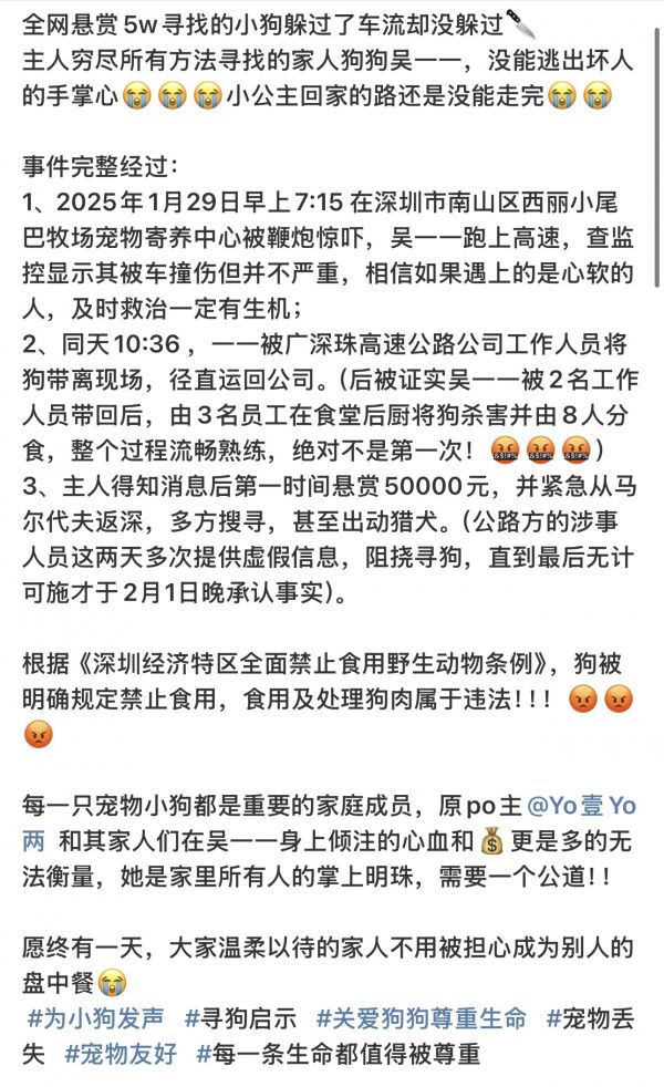 宠物狗走失后,网友立即发布寻狗悬赏,并从国外赶回深圳。回深后,该网友才得知,宠物狗已被高速公司的工作人员发现并带走,但令人震惊的是,这些工作人员竟然将宠物狗烹饪后分食。