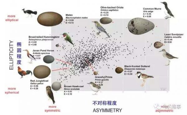 Why?鸟卵的形状为什么会有那么大的差异?概括性的解释是这些鸟卵的形状是不同鸟类生活史特征的一种适应性结果,换句话说就是每种鸟类为了适应各自的生存环境,有了不同的生活方式并且有了与之相适应的卵的形状(这个说法几乎可以用来解释各种生物的特征或者一些习性,其实等于没说)。当然,也有很多具体的假说来解释鸟卵的形状差异。例如,一些在悬崖上筑巢的鸟,所产的卵大多为圆锥形,这种形状的卵可以防止滚动时掉落悬崖;卵的形状可能和窝卵数有关,可能有助于提高孵化效率;卵的形状可能和鸟类的饮食以及发育模式等有关;也有假说认为鸟类适应飞行的一些身体结构的变化也影响了鸟卵的形状,例如骨盆、下腹部以及输卵管的大小。每种假说似乎都能自圆其说,但如果没有验证的话,假说就永远是假说,并没有太实际的意义。以往的一些验证性工作往往局限于一些小的类群或者样本量非常小,也没有考虑鸟卵的形态学数据以及相关的生活史参数。