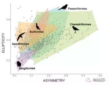 (以目为单位作出来卵形状差异图,面积最大的是鸻形目)