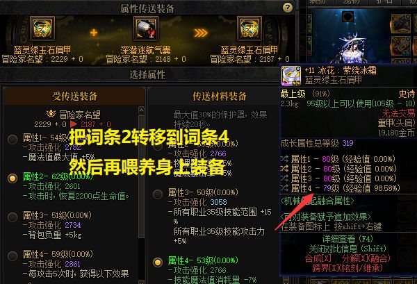 然后我掏出另一件自定义头肩,它的词条2是最高等级62级(此处仅为举例,实际上62级根本不值得转移),此时我会把词条2转移到另一件装备的词条4上,然后再进行完美喂养,我的蓝灵头肩就可以吃到62级的全部经验值了!