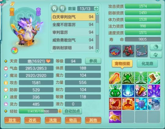 镇岳龙蜥变异满资质达到:1580攻、1430、1450、1119、1560,带上饰品可使所有资质提升20点达到1600的攻击资质+1580的速度资质。六技能这个资质,即便放在109也是非常强大的。没有特殊技能,卡级也没有星辉兽决,所以也只能做连击或者剑气宝宝。此宝宝的体防资质并不突出,因此比较契合敏攻、血攻、三维或盾宠。