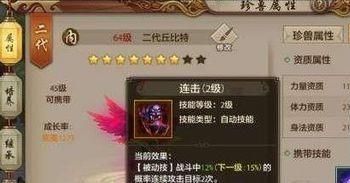 技能培养:技能培养首先需要说明的是只有二代的珍兽宝宝才可以培养,初始的珍兽宝宝是不可以的。技能培养就是将获得的宠物技能书,学习在宝宝的身上,每只珍兽宝宝可以学习4个自动技能和1个手动技能。珍兽学习的技能也可以选择遗忘,来学习新的技能。技能也是有等级的,每个技能都可以通过同样的技能书来提高技能等级,总共可以提升到5级。技能高也会更加的强力。技能书目前可以通过游戏中逞凶打图活动给予藏宝图来获得。使用藏宝图进行挖宝有一定几率获得宠物技能书。