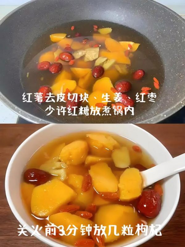 二、红皮红薯,它可是粗粮界的"黄金"。配上红枣枸杞煮成红薯红糖汤,补气血的效果不比阿胶差,关键还便宜!