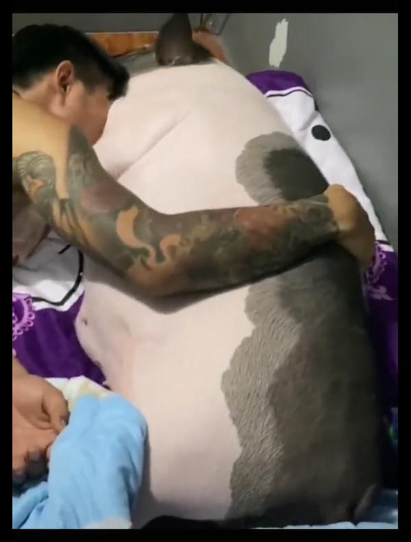 后面这男子很熟练地用手轻轻抚摸着猪的后背,他还把脸伏在猪的脖子上,轻轻地摩擦着,像是在撒娇一样。然后再把头抬起来,换一个睡姿之后,就用一只手抚摸着猪的脑袋,然后又把手伸在猪的嘴巴里玩耍着,看来彼此感情十分好。从视频中可以看到,这头猪很干净,真的是白白净净的,男子把它照顾得无微不至啊!真的很用心了。