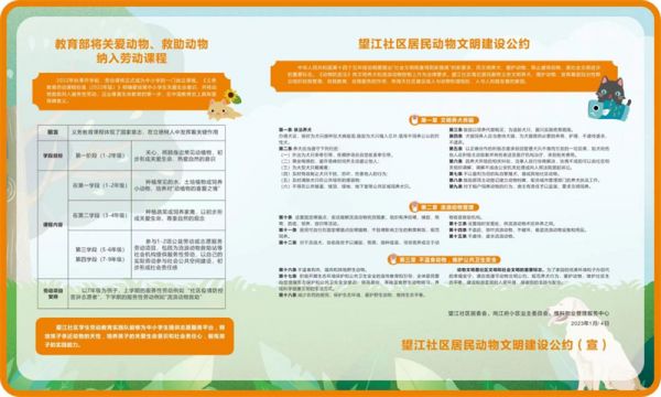 “刚来社区时,养狗的居民特别多,所以会出现有居民遛狗时不牵绳,或者喂养流浪动物时随地摆放猫粮狗粮的情况,后来通过我们一系列的措施,这里慢慢就形成了人人自觉的氛围。”林佳欣介绍,望江社区成立初期就推出“一事一议”制度,将文明养狗列入社区文明公约,开展养犬信息普查工作,建立社区犬只信息资料库,通过入户调查、线上发放问卷等方式,了解社区居民养犬状况、诉求。