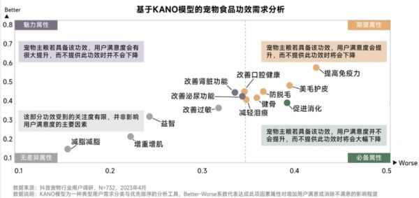 另外,据抖音2023年5月发布的《2023巨量引擎宠物行业白皮书》,基于KANO模型的宠物食品功效需求分析显示,减脂减脂功效受到的关注度有限,并非影响用户满意度的主要因素。