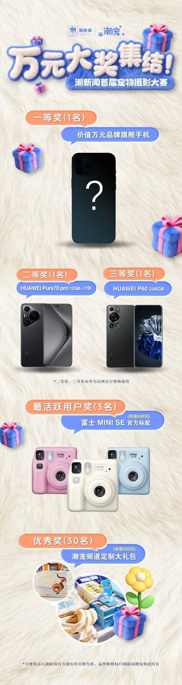 现在下载登录潮新闻APP,进入“我爱潮宠”圈子的大赛专区,发布作品即可完成报名,提前锁定参赛资格与线下活动参与机会。趁现在整理相册里的萌宠宝藏照片,或筹备全新拍摄计划,不仅有机会赢取价值万元的旗舰手机,还有华为官方赞助手机、富士拍立得等好礼等你来,总奖池价值破万元!除此以外,还能获得省级平台专题曝光、作品线下展览、浙江省摄影家协会专家面对面指导等多重福利。