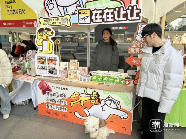 下午3点半,8个月大的萨摩耶“蒜头”在自家摊位前左右张望,白茸茸的脑袋随着人流转来转去。它可是“在在让让”摊位的“店长”。摊主介绍,他们是杭州本地做宠物食品的,“蒜头”从昨天就开始“上岗”,专门负责招揽顾客。