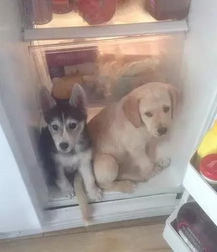 主人不在家,哥俩往冰箱里蹭一蹭