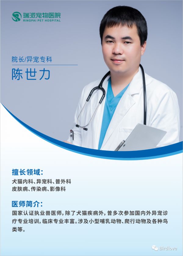 陈世力院长,异宠专科带头人,拥有丰富的鸟类治疗临床经验。