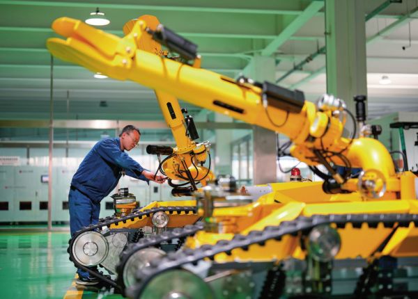 工人在河北唐山中信重工开诚智能装备有限公司车间内调试机器人产品(2025年2月18日摄)牟宇摄/本刊