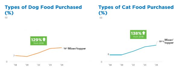 功能性添加剂和混合器呈现出急剧增长的态势,19%的猫主人和16%的狗主人表示他们在2024年购买了混合器或添加剂,分别比2018年增长了138%和129%。
