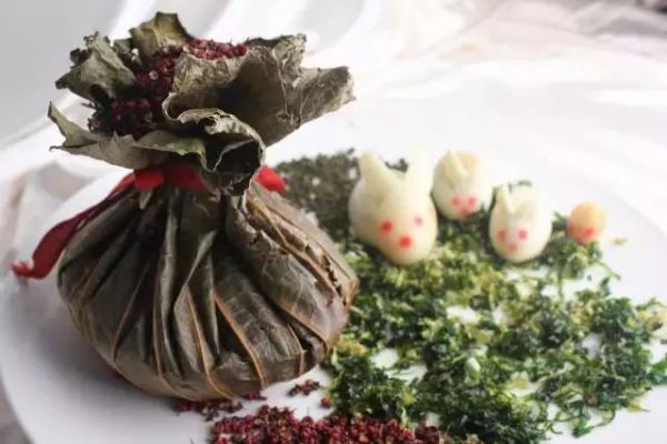 此菜是用荷叶包裹凉拌的椒麻带皮兔丁,成菜带有荷叶的清香味。