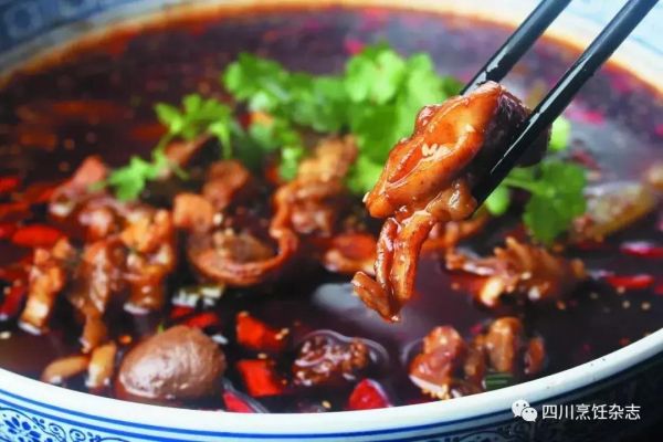 这道重口味的麻辣兔肴,是把鲜兔肉剁成大块,加泡椒、泡姜、花椒、香料等烧熟后,盛入大钵,最后浇炝香的辣椒、花椒,点缀香菜节成菜。