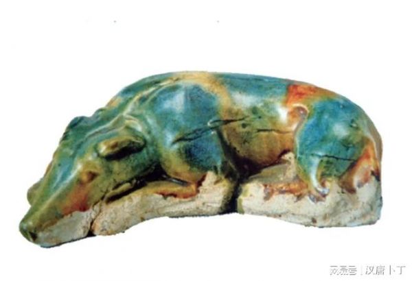 保存在陕西省考古研究院的唐代三彩陶狗,为随葬明器,手塑成型,尖喙,双眼圆睁,目视前方,两耳后伏。前蹄向前平伸,头部置于前蹄之上,身体蜷曲,呈卧姿憩息状。通身施绿、橙、淡黄色釉,露白胎,造型生动自然,神形兼备。