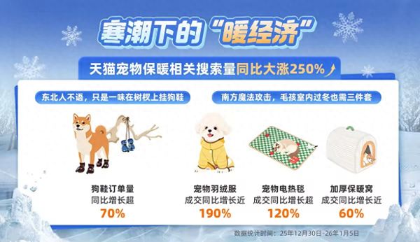 仅在过去一周,天猫上宠物保暖相关搜索量同比大涨近250%。这场消费热潮背后,是宠物家庭科学养护理念推动保暖用品从“季节性补充”升级为“常年刚需”,为千亿级宠物市场带来强劲活力。