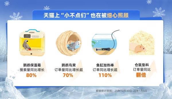 天猫数据显示,鹦鹉保温箱搜索量同比增长80%,鹦鹉鸟窝订单量同比增长超70%,陶瓷加热灯、温控站杆等专业设备密集上市,让主人不必在“怕它冷”和“怕它应激”间艰难取舍。鱼缸加热棒订单同比上涨超110%,观赏鱼在冬日也能徜徉于“恒温泳池”。仓鼠主人精心搭配纸棉、木屑等垫料,建造温暖巢穴,卡诺仓鼠垫料订单量同比翻倍。