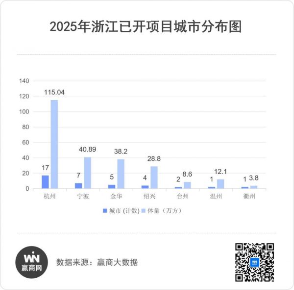 从区域分布看,杭州以开业 17个项目、总体量 115.04万平方米的规模,占据全省近半壁江山,龙头地位稳固。