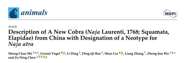 Shi, S. C.; Vogel, G.; Ding, L.; Rao, D. Q.; Liu, S.; Zhang, L.; Wu, Z. J.; Chen, Z. N. Description of A New Cobra (Naja Laurenti, 1768; Squamata, Elapidae) from China with Designation of a Neotype for Naja atra. Animals 2022, 12, 3481. https://doi.org/10.3390/ani12243481