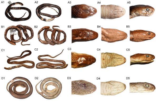 图2 不同眼镜蛇体型和头型的区别。A:舟山眼镜蛇;B:南亚地区的孟加拉眼镜蛇;C:东南亚地区的孟加拉眼镜蛇;D:西南眼镜蛇。图片引自(Shi et al., 2022)