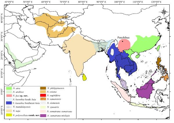 研究还为部分亚洲眼镜蛇物种进行了分类学厘定;参考最新资料,更新了亚洲眼镜蛇物种分布图(图5)。研究提出了南亚大陆和斯里兰卡岛屿的印度眼镜蛇为两个不同的物种,将斯里兰卡眼镜蛇N. polyocellata(Deraniyagala, 1939)提升为独立物种。 另外,该研究恢复了东南亚地区婆罗洲和巴拉望群岛的苏门答腊眼镜蛇亚种N. sumatrana miolepis (Boulenger, 1896)。 这些研究为东南亚和南亚蛇伤防治也提供了重要参考。