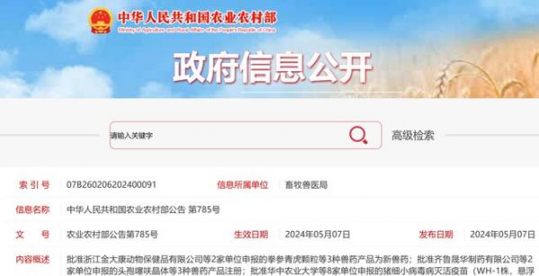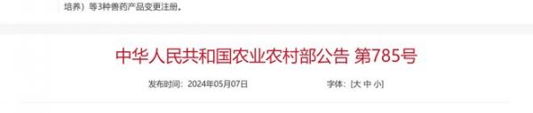 农业农村部公告 第785号 | 批准3种兽药产品为新兽药、3种兽药产品注册、3种兽药产品变更注册