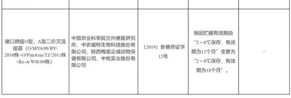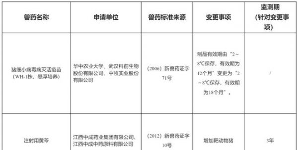 批准华中农业大学等5家单位申报的猪细小病毒病灭活疫苗(WH-1株,悬浮培养)等2种兽药产品变更注册,发布修订后的工艺规程、质量标准、说明书和标签,自发布之日起执行,此前发布的该产品工艺规程、质量标准、说明书和标签同时废止;批准中国农业科学院兰州兽医研究所等4家单位申报的猪口蹄疫O型、A型二价灭活疫苗(O/MYA98/BY/2010株+O/PanAsia/TZ/2011株+Re-A/WH/09株)变更注册,申请人按照农业农村部批准的说明书和标签自行修改并印制、使用。