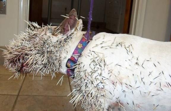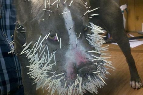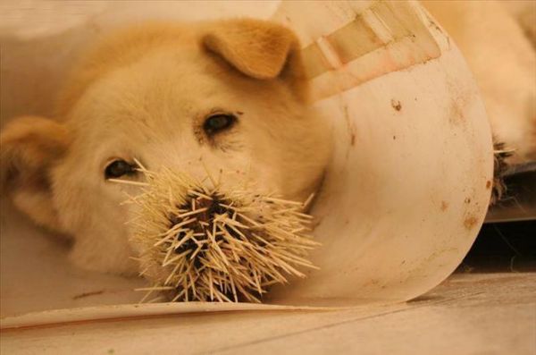 狗狗的嘴巴还有鼻子上面全部都是刺,隐隐能看出血迹。
