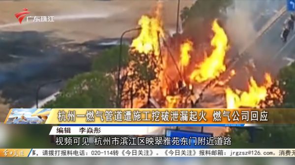 杭州一燃气管道遭施工挖破泄漏起火 燃气公司回应